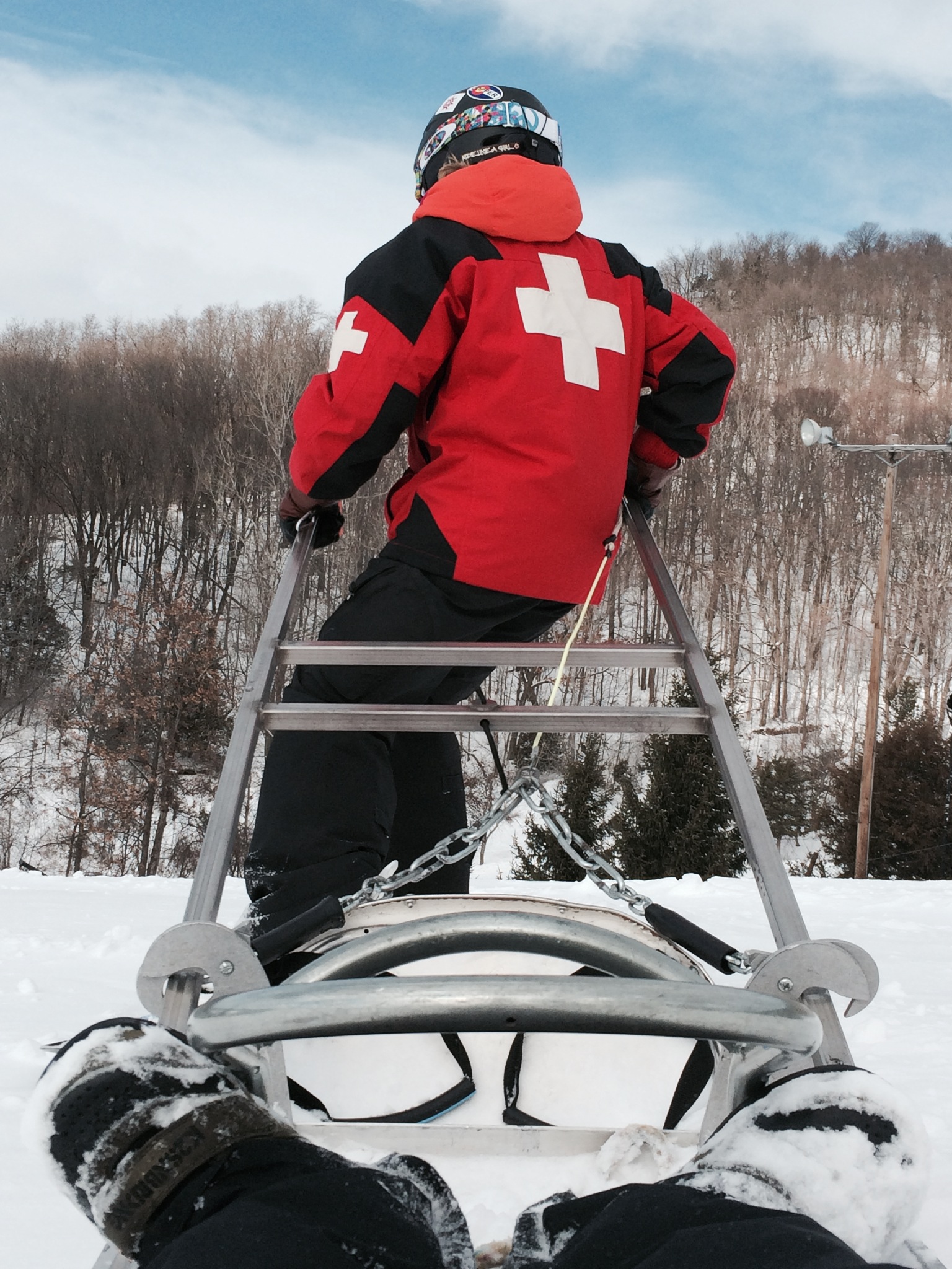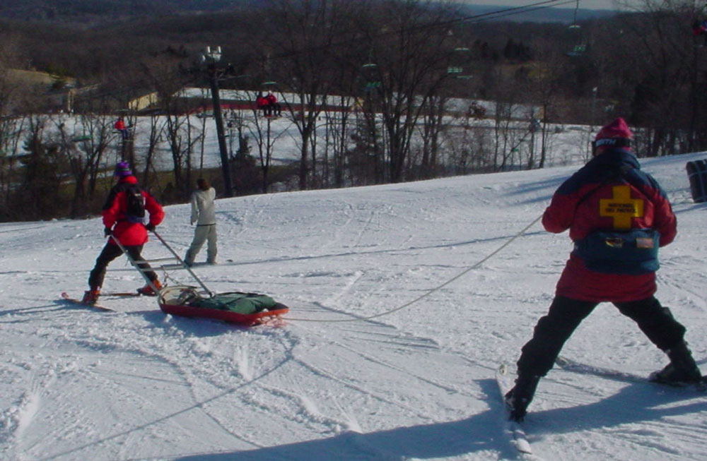 Ski Patrollers are taught procedures for loading the toboggan on the chairlift for transport up the hill.